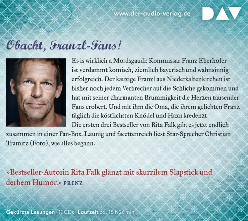 Es is wirklich a Mordsgaudi: Kommissar Franz Eberhofer ist verdammt komisch, ziemlich bayerisch und wahnsinnig erfolgreich. Der kauzige Franzl aus Niederkaltenkirchen ist bisher noch jedem Verbrecher auf die Schliche gekommen und hat mit seiner charmanten Brummigkeit die Herzen Tausender Fans erobert. Und mit ihm die Oma, die ihrem geliebten Franz täglich die köstlichsten Knödel und Haxn kredenzt. Die ersten drei SPIEGEL-Bestseller von Rita Falk – ‚Winterkartoffelknödel‘, ‚Dampfnufdelblues‘ und ‚Schweinskopf al dente‘ – gibt es jetzt erstmals zusammen in einer preisgünstigen Fan-Box. Launig und facettenreich gelesen von Star-Sprecher Christian Tramitz. Lesung mit Christian Tramitz12 CDs | ca. 15 h 26 min CD Standard Audio Format.