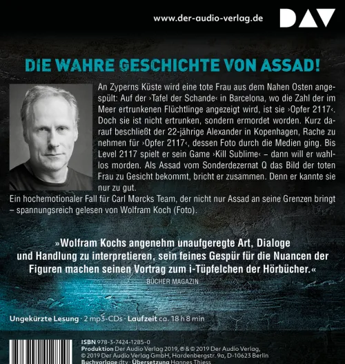 Auf Zypern wird eine Tote aus dem Wasser geborgen. Offenbar eine Geflüchtete aus dem Nahen Osten. Auf der sogenannten »Tafel der Schande« in Barcelona, wo die aktuelle Zahl der ertrunkenen Flüchtlinge angezeigt wird, ist sie das »Opfer 2117«. Doch die alte Frau ist nicht ertrunken, sondern wurde ermordet. In Kopenhagen spielt der 22-jährige Alexander das Computerspiel »Kill Sublime«. Das Foto des »Opfers 2117« hängt direkt vor ihm. Sein Hass auf die Gesellschaft, die gegenüber dem Elend der Welt gleichgültig ist, ist so groß, dass er beschließt, für diese Frau Rache zu nehmen, sobald er in »Kill Sublime« Level 2117 erreicht hat. Können Carl Mørck und Assad ihn rechtzeitig aufhalten?