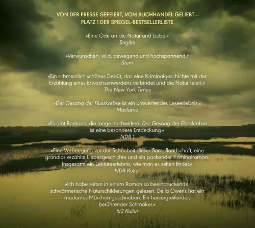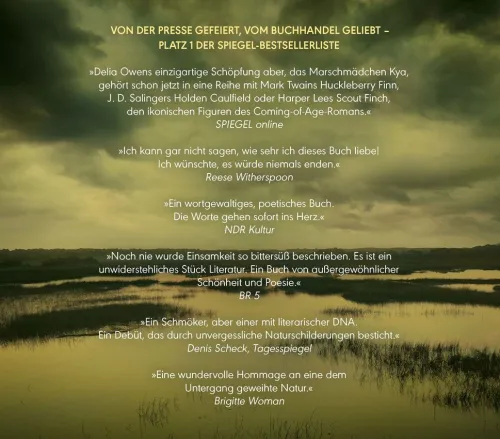 Chase Andrews stirbt, und die Bewohner der ruhigen Küstenstadt Barkley Cove sind sich einig: Schuld ist das Marschmädchen. Kya Clark lebt isoliert im Marschland mit seinen Salzwiesen und Sandbänken. Sie kennt jeden Stein und Seevogel, jede Muschel und Pflanze. Als zwei junge Männer auf die wilde Schöne aufmerksam werden, öffnet Kya sich einem neuen Leben – mit dramatischen Folgen. Delia Owens erzählt intensiv und atmosphärisch davon, dass wir für immer die Kinder bleiben, die wir einmal waren. Und den Geheimnissen und der Gewalt der Natur nichts entgegensetzen können.