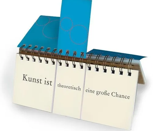 Unterhaltsamer Thesengenerator nach einer Idee der Journalistin Pia Frey, mit dem sich immer aus drei Komponenten und buchstäblich im Handumdrehen 125. 000 schlagkräftige Behauptungen generieren lassen, über die man jede Diskussion sofort auf die intellektuelle Metaebene ziehen kann. Maße: 21, 5 x 11 cm.