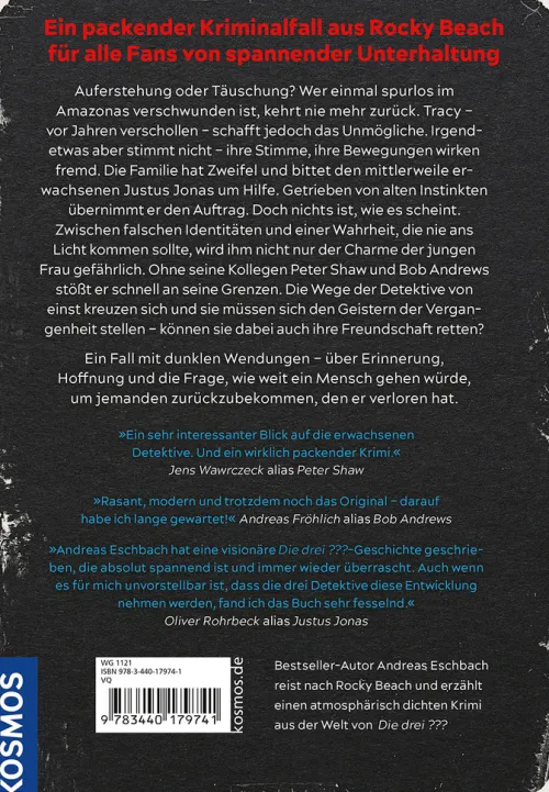 Bestseller-Autor Andreas Eschbach lässt die drei Detektive Justus, Peter und Bob als Erwachsene ein spannendes Rätsel lösen. Vor vielen Jahren ist eine Frau im brasilianischen Regenwald verschwunden. Jetzt taucht sie in Rocky Beach wieder auf. Die Wege der Freunde von einst kreuzen sich und sie übernehmen den Fall.