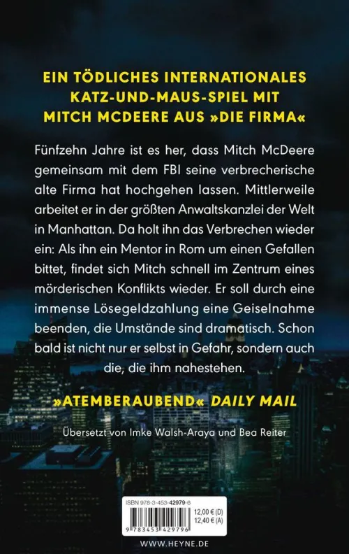 Fünfzehn Jahre ist es her, dass Mitch McDeere gemeinsam mit dem FBI seine verbrecherische alte Firma hat hochgehen lassen. Mittlerweile arbeitet er in der größten Anwaltskanzlei der Welt in Manhattan. Da holt ihn das Verbrechen wieder ein: Als ihn ein Mentor in Rom um einen Gefallen bittet, findet sich Mitch schnell im Zentrum eines mörderischen Konflikts wieder. Er soll durch eine immense Lösegeldzahlung eine Geiselnahme beenden, doch die Umstände sind dramatisch. Schon bald ist nicht nur er selbst in Gefahr, sondern auch die, die ihm nahestehen.