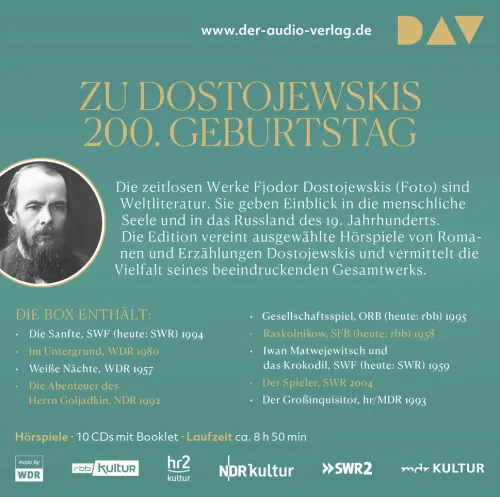 Die zeitlosen Werke Fjodor Dostojewskis sind Weltliteratur. Sie geben Einblick in die menschliche Seele und in das Russland des 19. Jahrhunderts. Dostojewski widmet sich in seinen häufig autobiographisch inspirierten Werken politisch-gesellschaftlichen Ideen und stellt religiös-philosophische Fragen: Was ist Schuld? Gibt es Gott? Bekannt ist der Autor aber auch für seine humoristischen Erzählungen, deren alberne Skurrilität sie jedoch nicht ihres Tiefgangs enthebt. Die Edition vereint ausgewählte Hörspiele zu Romanen und Erzählungen Dostojewskis und vermittelt die Vielfalt des beeindruckenden Gesamtwerks. Hörspiel mit Leslie Malton, Ignaz Kirchner, Eva Garg10 CDs | ca. 8 h 50 min