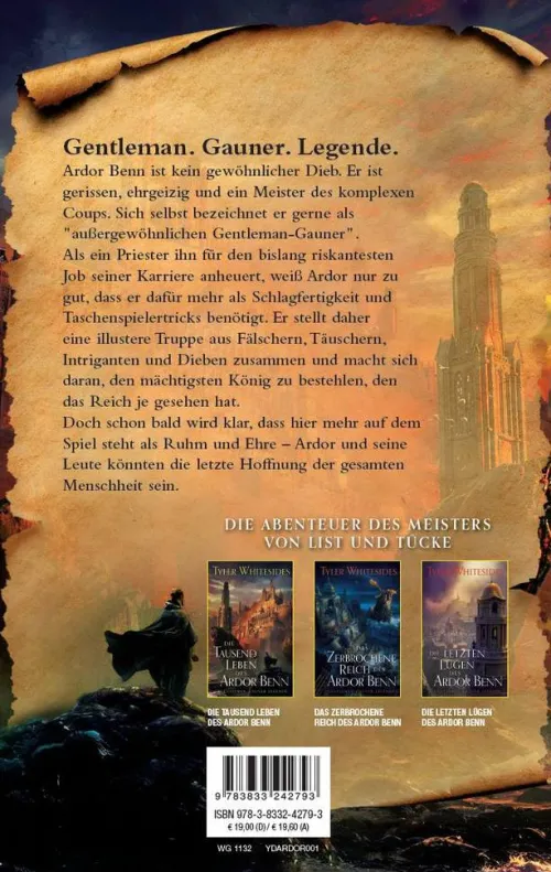 Gentleman. Gauner. Legende. Ardor Benn ist kein gewöhnlicher Dieb. Er ist gerissen, ehrgeizig und ein Meister des komplexen Coups. Sich selbst bezeichnet er gerne als „außergewöhnlichen Gentleman-Gauner“. Als ein Priester ihn für den bislang riskantesten Job seiner Karriere anheuert, weiß Ardor nur zu gut, dass er dafür mehr als Schlagfertigkeit und Taschenspielertricks benötigt. Er stellt daher eine illustere Truppe aus Fälschern, Täuschern, Intriganten und Dieben zusammen und macht sich daran, den mächtigsten König zu bestehlen, den das Reich je gesehen hat. Doch schon bald wird klar, dass hier mehr auf dem Spiel steht als Ruhm und Ehre – Ardor und seine Leute könnten die letzte Hoffnung der gesamten Menschheit sein. Band 1 von „Die Abenteuer des Meisters von List und Tücke“Überblick über die Reihe „Die Abenteuer des Meisters von List und Tücke“Band 1: Die Tausend Leben des Ardor BennBand 2: Das zerbrochene Reich des Ardor BennBand 3: Die letzten Lügen des Ardor Benn