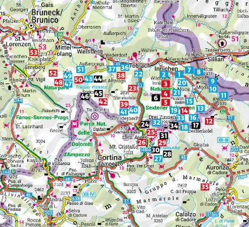 Klassiker wie die Umrundung der Drei Zinnen, Touren zur Auronzohütte, über den Paternsattel oder zum Pragser Wildsee fehlen ebenso wenig wie stille Wege abseits der bekannten Routen. Immer wieder eröffnen sich großartige Ausblicke auf die markanten Felstürme der Drei Zinnen zu Recht UNESCO-Welterbe.