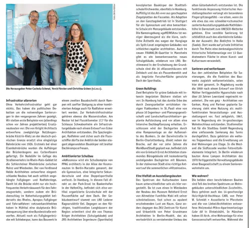 Mit dieser Ausgabe erscheint der „Architekturführer Deutschland“ zum nunmehr zehnten Mal. In bewährter Weise stellt er das jüngste Baugeschehen anhand von mehr als 100 vorbildlichen, originellen oder experimentellen, auf jeden Fall aber bemerkenswerten Gebäuden vor von Meldorf in Schleswig-Holstein bis Wangen im Allgäu, von Düsseldorf bis Küstrin-Kietz. Die Auswahl, über die eine Experten-Jury entschieden hat, entspricht der Longlist für den DAM Preis für Architektur in Deutschland 2026. Thematische Schwerpunkte sind unter anderem Verkehrsinfrastruktur-Projekte etwa die Schiersteiner Rheinbrücke zwischen Mainz und Wiesbaden , wiederbelebte Ortszentren im ländlichen Raum mit Vereinsräumen, Cafés, Museen und »Green Buildings« wie der umgebaute riesige Flakbunker in St. Pauli, der eine intensive Dachbepflanzung erhalten hat.