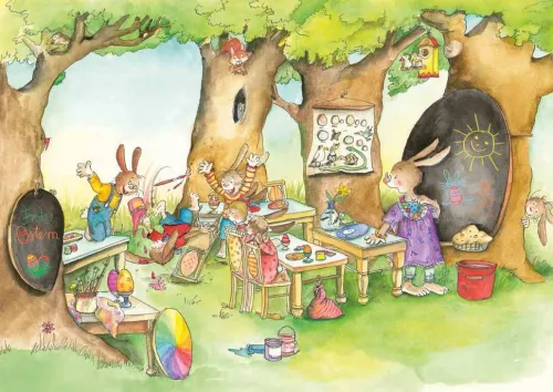Kaputte Ostereier, umgestürzte Farbtöpfe: Das Kamishibai lässt die Geschichte lebendig werden!