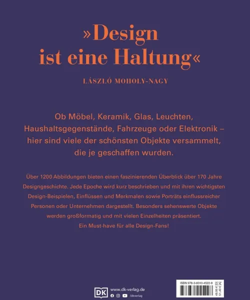 Die aufwendig gestaltete Enzyklopädie gibt Interessierten neben einem Einblick in die Ursprünge unseres Design-Verständnisses einen Überblick über Design-Epochen. Werkzeuge und Elemente von Design werden ebenso aufgezeigt wie wichtige Einflüsse und Meilensteine. Sonderseiten zeigen dabei besonders sehenswerte Objekte großformatig und mit vielen Einzelheiten. Auch einflussreiche Gestalter, Gruppen oder Unternehmen von Thonet über Gaudí bis IKEA erhalten eigene Sonderseiten. So bleiben keine Fragen offen!