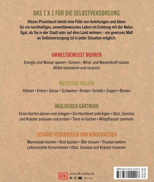 Welche erneuerbaren Energien können genutzt werden und wie hält man Tiere am besten? Wie gelingen das Energiesparen zu Hause, der eigene Anbau von Obst, Gemüse und Kräutern sowie die Herstellung von Wein? Wie wird man Hobby-Imker*in? Wie kann im Alltag Plastik vermieden werden? Welche essbaren Blüten kann man im eigenen Garten anpflanzen? Der aktualisierte DK-Bestseller für Selbstversorger liefert die Antworten für ein umweltbewussteres und nachhaltiges Leben: