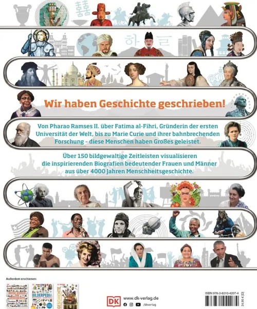Dieses Buch ist eine reich bebilderte Zeitreise für die ganze Familie. Dabei werden die wichtigsten historischen Personen quer durch alle Epochen aus über 4000 Jahren Menschheitsgeschichte vorgestellt. Einzigartig illustrierte Biografien visualisieren das Leben und die Meilensteine bedeutender Frauen und Männer.