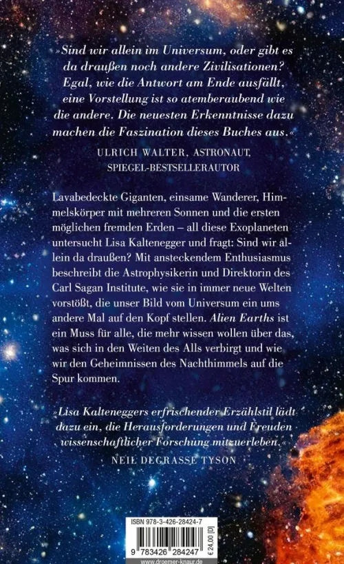 »Die Suche nach fremden Planeten ist eine der aufregendsten Herausforderungen der modernen Astronomie, und Lisa Kaltenegger ist eine der führenden Expertinnen auf diesem Gebiet. Alien Earths ist authentisch, spannend und kompetent geschrieben und nimmt die Leser*innen mit in eine im wahrsten Sinn des Wortes andere Welt. « Heino Falcke, Radioastronom, Astrophysiker und SPIEGEL-Bestsellerautor