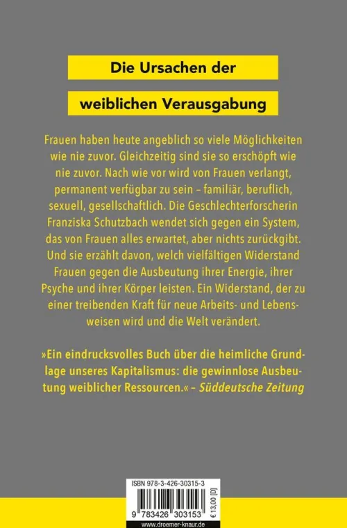 Franziska Schutzbach stellt heraus, welch vielfältigen Widerstand Frauen gegen die Ausbeutung ihrer Energie, ihrer Psyche und ihrer Körper leisten. Ein Widerstand, der zu einer treibenden Kraft für neue Arbeits- und Lebensweisen wird und die Welt verändert.