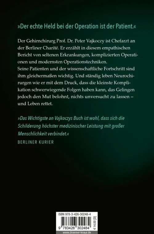 Es ist ein schmaler Grat, auf dem Prof. Vajkoczy und sein Team unterwegs sind, und zwar immer, an jedem Tag, bei jeder Operation, selbst wenn sie noch so beherrschbar scheint. In aufrichtiger Offenheit erzählt Prof. Vajkoczy, wie er und sein Team mit dieser Herausforderung umgehen, wie schwierigste Operationen geplant und ausgeführt werden, was ihn als Neurochirurgen antreibt und was er fühlt, wenn er scheitert – und wenn sein Plan gelingt.