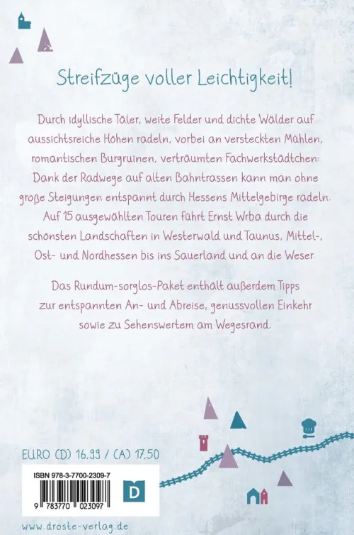 Durch idyllische Täler, weite Felder und dichte Wälder auf aussichtsreiche Höhen radeln, vorbei an versteckten Mühlen, romantischen Burgruinen, verträumten Fachwerkstädtchen dank der Radwege auf alten Bahntrassen kann man ohne große Steigungen entspannt durch die Mittelgebirge in Hessen radeln. Auf 15 ausgewählten Touren führt Ernst Wrba durch die schönsten Landschaften in Westerwald und Taunus, Mittel- und Nordhessen bis ins Sauerland und an die Weser.