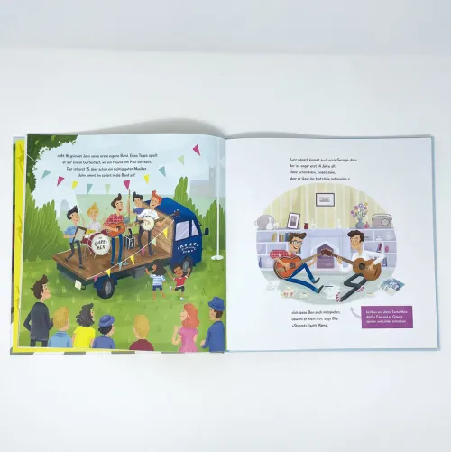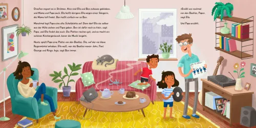 Ella und ihr kleiner Bruder Ben lieben Musik – genau wie ihre Eltern. Heute holt Papa eine alte Schallplatte aus dem Schrank und erzählt den beiden von vier Jungs aus Liverpool, der erfolgreichsten Band aller Zeiten. Ella und Ben begeben sich auf eine Zeitreise in die wilden 1960er und zugleich auf eine Fantasiereise zu gelben U-Booten, Unterwassergärten und Erdbeerfeldern.