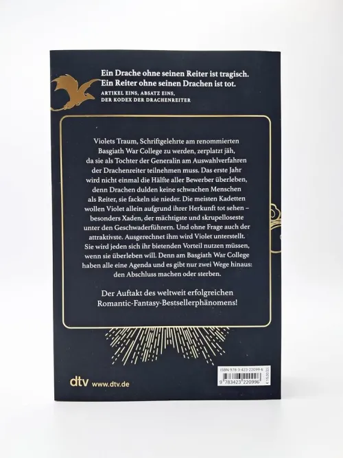Violets Traum, Schriftgelehrte am renommierten Basgiath War College zu werden, zerplatzt jäh, da sie als Tochter der Generalin am Auswahlverfahren der Drachenreiter teilnehmen muss. Das erste Jahr wird nicht einmal die Hälfte aller Bewerber überleben, denn Drachen binden keine schwachen Menschen, sie fackeln sie nieder. Die meisten Kadetten wollen Violet allein aufgrund ihrer Herkunft niederstrecken – besonders Xaden, der mächtigste und skrupelloseste unter den Geschwaderführern. Und ohne Frage auch der attraktivste. Ausgerechnet ihm wird Violet unterstellt. Sie wird jeden Vorteil nutzen müssen, wenn sie überleben will. Denn am Basgiath War College haben alle eine Agenda und es gibt nur zwei Wege hinaus: den Abschluss machen oder sterben.