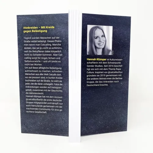 »Geiler Arsch! « oder »Du hast ja gar keine Titten! « sind nur zwei von unendlich vielen dummen Sprüchen, die sich Mädchen, Frauen und diversgeschlechtliche Menschen in Deutschland und aller Welt ständig anhören müssen. Einfach so, öffentlich. Die Leute gucken, ein paar schütteln den Kopf, keiner sagt was. Catcalling nennt man das. Oft bleibt bei den Betroffenen ein Gefühl von Scham, Schuld und Angst zurück: Hab ich was falsch gemacht? War es nur ein Kompliment? Wie kann ich mich wehren? Die Chalk-Back-Bewegung hat eine klare Antwort: nicht mehr schweigen oder wegschauen! Weltweit gibt es über 280 Gruppen, 119 davon in Deutschland. Aktivist:innen schreiben die Catcalls mit Kreide auf die Straße – genau dort, wo sie passiert sind, und machen sie auch auf Instagram sichtbar.