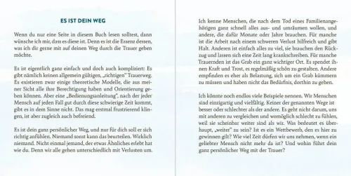 Die Trauer um einen geliebten Menschen ist ein sehr persönlicher, individueller Prozess, bei dem es kein »richtig« oder »falsch« gibt: Trauerbegleiterin Silke Szymura möchte mit diesem Geschenkbuch Trauernden dabei helfen, ihren eigenen Weg zu finden, um den Schmerz zu verarbeiten und gleichzeitig die Verbindung und Erinnerung an den Verstorbenen zu bewahren. Die ehrlichen und verständnisvollen Texte beschäftigen sich mit Trauer in all ihren Facetten und bieten Rat und Unterstützung in dieser schweren Zeit. Ein einfühlsames Geschenk, das Trauernde auf dem Weg der Trauerarbeit liebevoll begleitet.