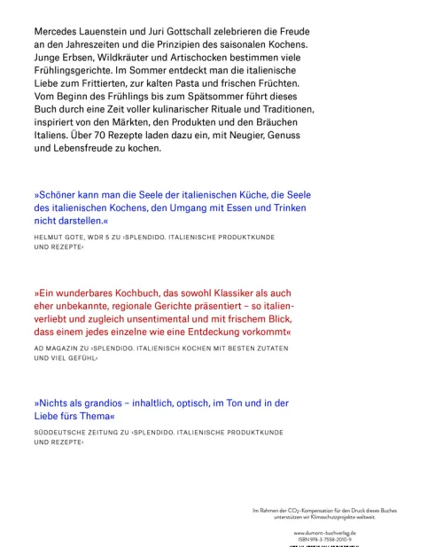 Traditionelle Spezialitäten spielen zu bestimmten Anlässen eine große Rolle in Italien. Mit Mönchsbart, Artischocke und Favabohne wird der Frühling eingeläutet. Zur Festa della Donna am 8. März darf die Torta Mimosa nicht fehlen, zu San Giuseppe am 19. März gibt es in jeder Pasticceria Unmengen von Zeppole. In den Abruzzen gibt es keinen 1. Mai ohne den Gemüseeintopf Virtù und in Sizilien frühstückt man an den heißesten Tagen des Jahres Mandelgranita. Welche Rezepte hat der norditalienische Kirschenanbau hervorgebracht, und welchen Stellenwert hat in Italien eigentlich der Spargel? Ob Risotto, Salat oder Pasta, Mercedes Lauenstein und Juri Gottschall zeigen wieder einmal, wie wenig es für ein wirklich gutes Essen braucht: Die Botschafter der echten italienischen Esskultur plädieren dafür, mit hochwertigen Produkten und ohne exakte Mengenangaben zu einer höheren Genussebene zu gelangen. Im Doppelpack mit Autunno/Inverno erreicht auch dieser Band von Mercedes Lauenstein und Juri Gottschall den 1. Platz beim Deutschen Kochbuchpreis 2025, diesmal in der Rubrik ‚Foodfotografie‘, nachdem sie 2022 den Deutschen Kochbuchpreises als ‚Newcomer‘ für ihr erstes Kochbuch erhielten und 2023 für ihr zweites Buch mit Gold in der Kategorie ‚Italienische Kochbücher‘ ausgezeichnet wurden. Mit fundierten Texten zu saisonalen Besonderheiten von Kultur und Landwirtschaft, wunderbaren Fotos und über 70 neuen Frühlings- und Sommerrezepten nehmen sie uns an die Hand und lassen ihre Begeisterung für Italien überspringen.