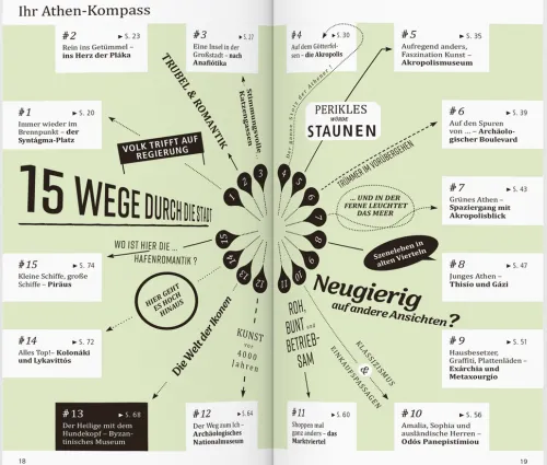 In eigenen Kapiteln erfahren Sie, wo es sich in fremden Betten gut schläft, wo Sie glücklich satt werden, wohin die Athener zum Stöbern und Entdecken gehen und wohin es sie zieht, wenn die Nacht beginnt.
