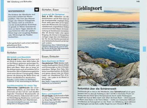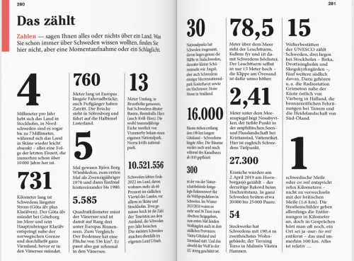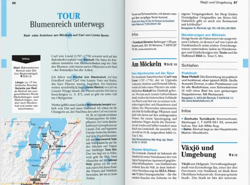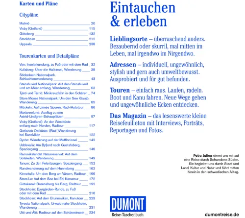 Senkrechtstarter, Überflieger, Querfeldein. Vor Ort die Kapitel: West-Skåne und Halland, Ost-Skåne und Blekinge, Småland und Öland, Gotland, Göteborg und Bohuslän, Vänersee und Dalsland, Vom Vättersee zum Mälarsee, Stockholm und Umland. Das Kleingedruckte (Reiseinfos von A bis Z). Das Magazin.