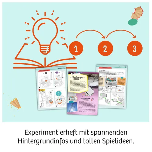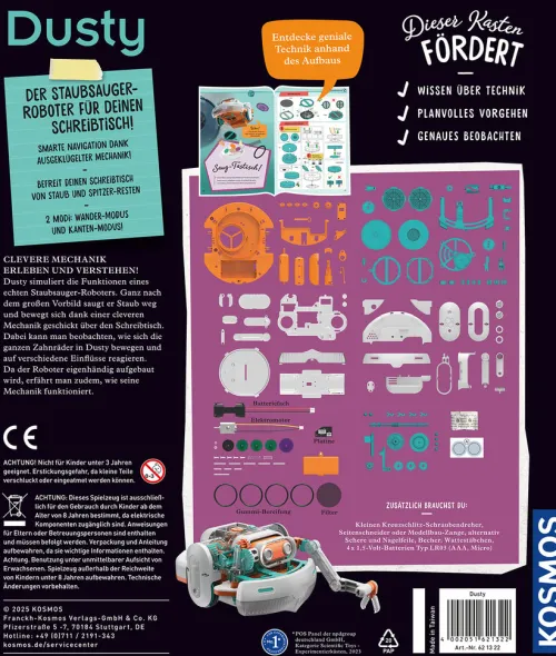 Dieser kleine Robo-Helfer sorgt für Ordnung auf dem Schreibtisch und gibt spannende Einblicke in die Technik von Saugrobotern! Ganz wild nach Staub und Krümeln fährt Dusty über den Tisch und saugt wie ein echter Saugroboter Schmutzpartikel einfach weg. Geniale mechanische Sensoren verhindern, dass der kleine Roboter abstürzt oder steckenbleibt und transparente Bauteile geben spannende Einblicke in sein Innerstes. Die farbige Anleitung erklärt den Aufbau des Roboters und zeigt, wie er den Schreibtisch ganz spielend sauber hält. „Wie die Großen“ halten Kinder ab acht Jahren mit diesem KOSMOS-Set Ordnung auf dem Schreibtisch und bauen sich gleichzeitig einen sympathischen Alltagsbegleiter selber. Er fährt, saugt und ist ganz wild nach Staub und Krümeln: Dusty, der kleine Saugroboter zum Selberbauen, sorgt nicht nur für Stimmung im Kinderzimmer, sondern auch spielend leicht für Ordnung auf dem Schreibtisch. Batteriebetrieben beseitigt Dusty wie seine „großen“ Vorbilder Schmutzpartikel von der Tischplatte und geniale mechanische Sensoren verhindern Feststecken oder Abstürzen. Doch Dusty ist nicht nur clever, sondern auch sympathisch und legt mit wechselnden Gesichtsausdrücken seinen ganz eigenen Charakter an den Tag. Dank transparenter Teile lässt sich tief in seine Mechanik schauen. Ein ganz besonderer Spaß – und praktisch obendrein!