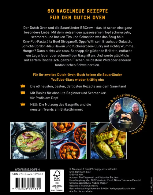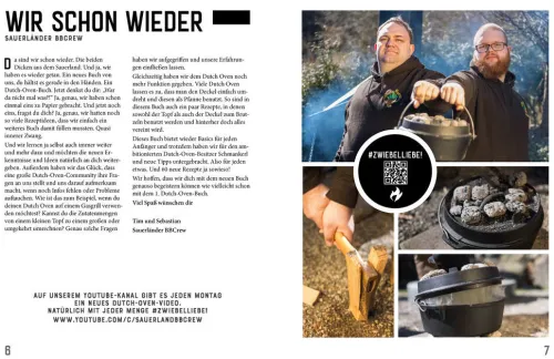 Einmal vorbereitet und befüllt kocht das Essen quasi von allein. Die gusseiserne Power sorgt dafür, dass die Hitze sich gleichmäßig verteilt und lange gehalten wird. Auf seinen drei Beinen steht er sicher, der dicht schließende Deckel mit dem hochgezogenen Rand lässt sich mit Kohlen oder Briketts belegen. Durch die Verteilung der Kohle auf und unter dem Dutch Oven lässt sich Ober- und Unterhitze steuern. So bekommen Eintöpfe, Brote und Gratin im Topf die optimale Hitzezufuhr. Für alle, die mit einem Gasgrill arbeiten: Keine Sorge, auch für euch eignet sich der Dutch Oven. Wie das genau geht, bringen euch die Sauerländer in diesem Buch bei.
