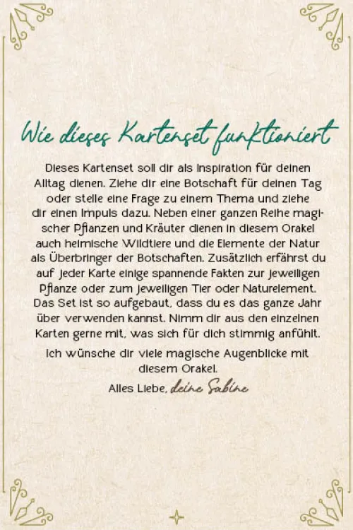 Mehr als 60 magische Orakelkarten warten in dieser Kartenbox darauf, von dir zum Leben erweckt zu werden. Ob Entscheidungshilfe oder Tagesmotto, die Sehnsucht nach einem weisen Rat oder ein Wink des Schicksals – das grüne Magie-Orakel nutzt die Kraft der Tier– und Pflanzenwelt in Verbindung mit Botschaften des Universums dafür, dir stets eine inspirierende Eingebung zu geben.