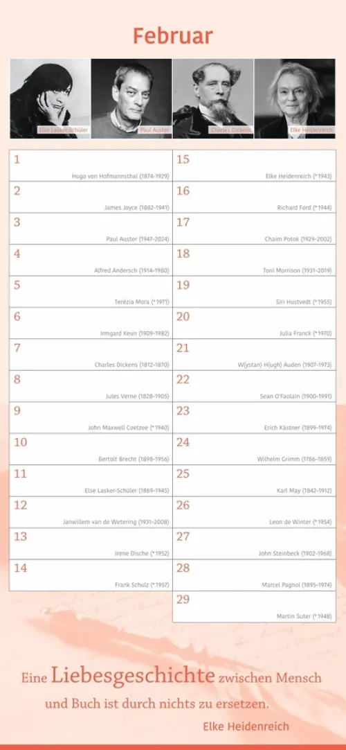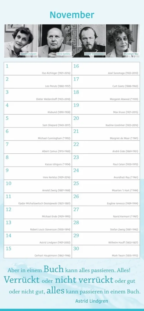 – Keinen Geburtstag von Familie und Freunden mehr vergessen: immerwährender Kalender mit Platz für eigene Eintragungen – ohne Jahreszahl, unbegrenzt nutzbar- Kalendarium mit einem literarischen Geburtstagskind pro Tag: Autor:innen, Schriftsteller:innen und Literat:innen- Geburtstagskind des Monats – Januar bis Dezember Porträts in Bildern und Worten- Inspirierende Zitate und literarische Worte aus der Welt der Literatur- Hochwertiger Wandkalender im länglichen Format (16 × 34, 7 cm) – ideal für Küche, Büro oder Arbeitszimmer- Literarische Kalender für die schönen Seiten des Lesens: Die edition momente im Athesia Kalenderverlag