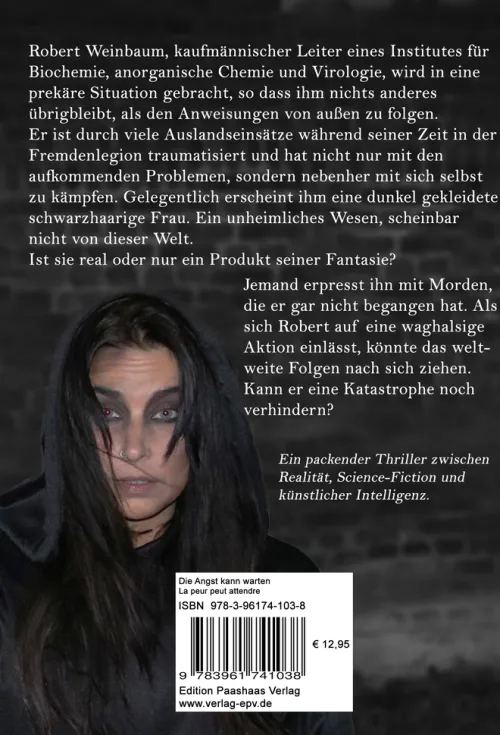 Robert Weinbaum, kaufmännischer Leiter eines Institutes für Biochemie, anorganische Chemie und Virologie, wird in eine prekäre Situation gebracht, so dass ihm nichts anderes übrigbleibt, als den Anweisungen von außen zu folgen. Er ist durch viele Auslandseinsätze während seiner Zeit in der Fremdenlegion traumatisiert und hat nicht nur mit den aufkommenden Problemen, sondern nebenher mit sich selbst zu kämpfen. Gelegentlich erscheint ihm eine dunkel gekleidete schwarzhaarige Frau. Ein unheimliches Wesen, scheinbar nicht von dieser Welt. Ist sie real oder nur ein Produkt seiner Fantasie?