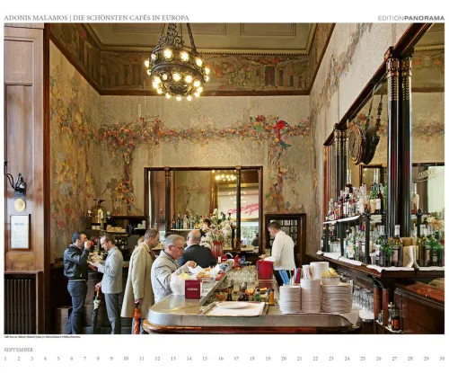 Für diesen Kalender porträtiert Adonis Malamos Cafés unter anderem aus Österreich, Polen, Italien, England, Finnland, Portugal und Deutschland. Die Idee ausgedehnte Reisen durch Europa zu unternehmen, um die schönsten Caféhäuser kennen zu lernen, gab die Beschäftigung mit der Geschichte jenes Gebäudes in den Mannheimer Quadraten, in welchem sich heute sein „Café Prag“ befindet. Was anfänglich als eine Bildungsreise gedacht war, entwickelte sich nach intensiver Beschäftigung mit der europäischen Kaffeehauskultur zu einer Leidenschaft. Begonnen hat sein Projekt mit ersten Reisen nach Italien – mit der Zeit kamen viele Länder Europas und Südamerikas hinzu. Ihn interessieren nicht nur die Geschichte der jeweiligen Kaffeehäuser oder ihre architektonischen Merkmale. Sein Blick richtet sich auch auf die Besonderheiten der Inneneinrichtungen, auf die Rituale des Personals und der Gäste sowie auf die noch heute anzutreffende, leider immer seltener werdende Pflege einer langen Tradition. Dabei war ihm wichtig, jene besonderen Cafés aufzusuchen, die sich jenseits der heute oft anzutreffenden flüchtigen Trends gegen den Zeitgeist des Massenkonsums behaupten.