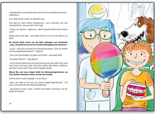Hund Wolli findet das klasse, denn der hilft jeden Tag fleißig in der Zahnarztpraxis mit und freut sich am meisten darüber, wenn alle Zähne kräftig zubeißen können.