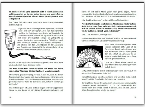 Leider hat Lena Karies und braucht eine kleine Reparatur. Die ist zum Glück rasch erledigt. Und damit das mit dem Loch im Zahn nicht wieder vorkommt, hat Frau Doktor Grünzahn für Lena und ihre Mama jede Menge guter Tipps parat.