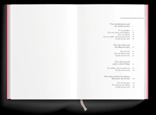 Aufgeteilt in vier Themenblöcke: 1. Über das Kleinsein und das Größerwerden, 2. Über die Liebe und das Mutterwerden, 3. Über Freizeit und andere schöne Dinge, 4. Über dich und den besonderen Menschen, der du bist