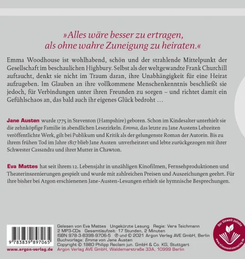 Die 21-jährige Emma Woodhouse ist wohlhabend, schön und der strahlende Mittelpunkt der Gesellschaft im beschaulichen Highbury. Das angenehme Leben mit ihrem etwas lebensfremden Vater genießt sie in vollen Zügen und denkt nicht daran, ihre Unabhängigkeit für eine Heirat aufzugeben. Im Glauben an ihre vollkommene Menschenkenntnis beschließt sie jedoch, zumindest für Verbindungen unter ihren Freunden zu sorgen, und richtet damit ein Gefühlschaos an, das bald auch ihr eigenes Glück bedroht . . .