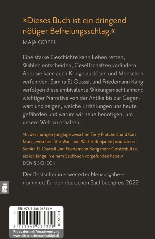 Eine starke Geschichte kann die Welt retten – oder sie zerstören. Sie kann Wahlen entscheiden, Menschenleben retten, aber auch Kriege auslösen und Ungerechtigkeit zementieren. Samira El Ouassil und Friedemann Karig verfolgen diese ambivalente Wirkungsmacht anhand wichtiger Narrative von der Antike bis zur Gegenwart. Und sie zeigen, welche Erzählungen uns heute gefährden und warum wir neue benötigen. Wie gelingt es, den Klimawandel so zu erzählen, dass er zum Handeln drängt? Aus welchen Überlegenheitsmythen entstehen Rassismus und Antisemitismus? Mit welchen Storys manipulierte Trump seine Anhänger, und weshalb verfangen die Lügen der Querdenker und Verschwörungsideologen? Was erzählen wir seit jeher über uns selbst – als Deutsche, als Europäer, als Humanist:innen, über unsere Republik? Gibt es Alternativen dazu? Wie könnte eine wirkungsmächtige neuen Erzählung der Aufklärung aussehen? Geschichten sind ein maßgeblicher Teil unserer Sozialisation. Sie durchdringen Politik, Medien und Kultur, lehren uns, unterhalten uns, verführen uns, beeinflussen unsere Wirklichkeitswahrnehmung – vom griechischen Drama bis zur Netflix-Serie.