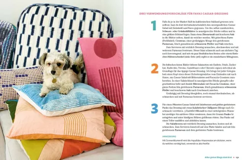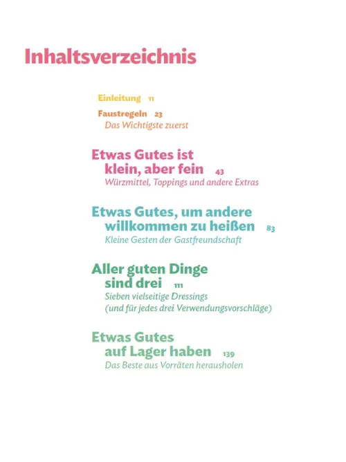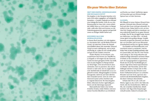 Zudem enthält Etwas Gutes wertvolle Tipps welche Zutaten man wirklich immer zu Hause haben muss (Zitrusfrüchte! Parmesan! Miso!), wie man Olivenöl einkauft (auf das Erntedatum achten!), wofür man tiefer in die Tasche greifen sollte (nur beste Zutaten fürs Salatdressing!) und Tricks, die jedes Essen um Klassen besser aussehen lassen.