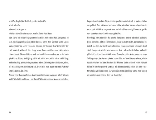 über den fröhlichen Herrn Hopp und seine Tiere beginnt als heitere Erzählung. Mit gutmütigem Augenzwinkern lässt Willemsen den stinkstiefeligen Herrn Gottlieb gegen den gutgelaunten Hopp antreten. Die Sache scheint klar: Hopps Welt ist die, von der alle träumen. Doch dann lüftet der garstige Gottlieb Hopps Geheimnis und das Blatt wendet sich. Denn jede Geschichte hat ihr Gesetz. Und niemandem gehört das Glück.