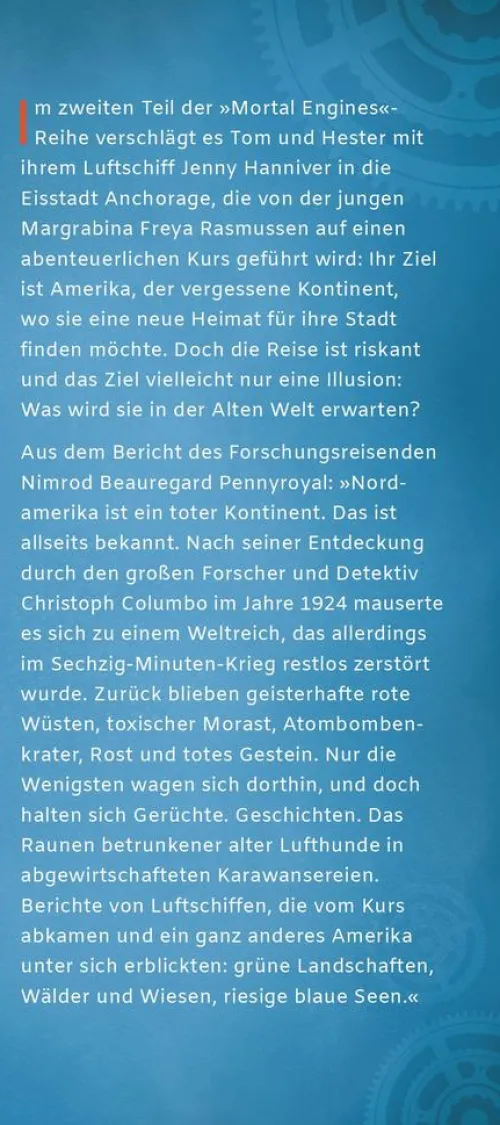 Vor zwei Jahren hat sich London selbst zerstört. Tom und Hester leben seitdem an Bord ihres Luftschiffs Jenny Haniver und bereisen die Welt als Händler und Abenteurer. Als in Airhaven ein Passagier ihre Dienste in Anspruch nehmen will, überlegen sie deshalb nicht lange. Zumal es sich um Nimrod Pennyroyal handelt, den größten Forschungsreisenden der Welt. Was könnte da schon schiefgehen?