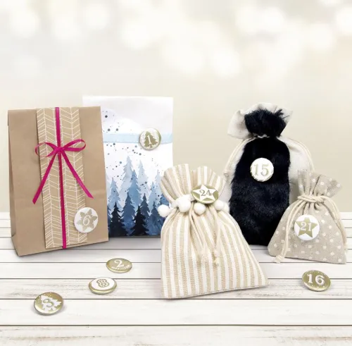Mit den Buttons lässt sich spielend leicht ein individueller Adventskalender zaubern, die Buttons sind aus Blech und in unterschiedlichen Designs gestaltet und lassen sich mit der Ansteck-Sicherheitsnadel ganz einfach an unterschiedlichsten Materialien befestigen, dadurch können Sie im Handumdrehen Beutelchen und Geschenke nummerieren und verleihen damit ein schicken und kreativen Touch.
