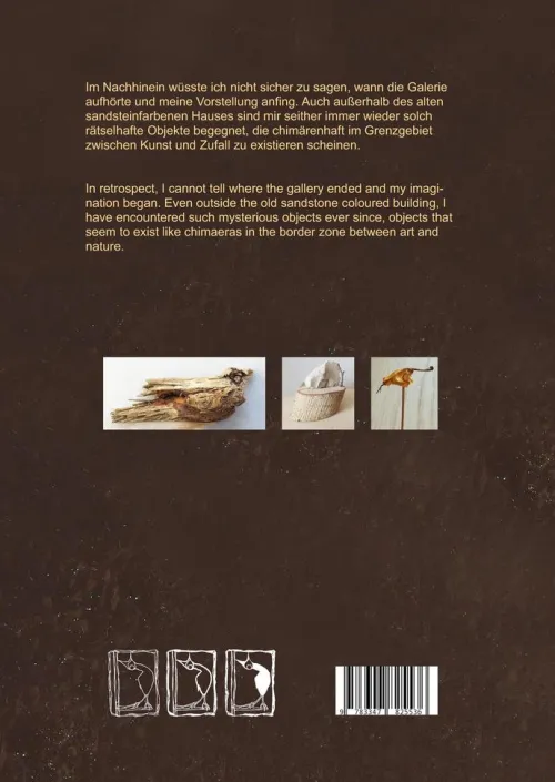 Im Nachhinein wüsste ich nicht sicher zu sagen, wann die Galerie aufhörte und meine Vorstellung anfing. Auch außerhalb des alten sandsteinfarbenen Hauses sind mir seither immer wieder solch rätselhafte Objekte begegnet, die chimärenhaft im Grenzgebiet zwischen Kunst und Zufall zu existieren scheinen. *** In retrospect, I cannot tell where the gallery ended and my imagination began. Even outside the old sandstone coloured building, I have encountered such mysterious objects ever since, objects that seem to exist like chimaeras in the border zone between art and nature.