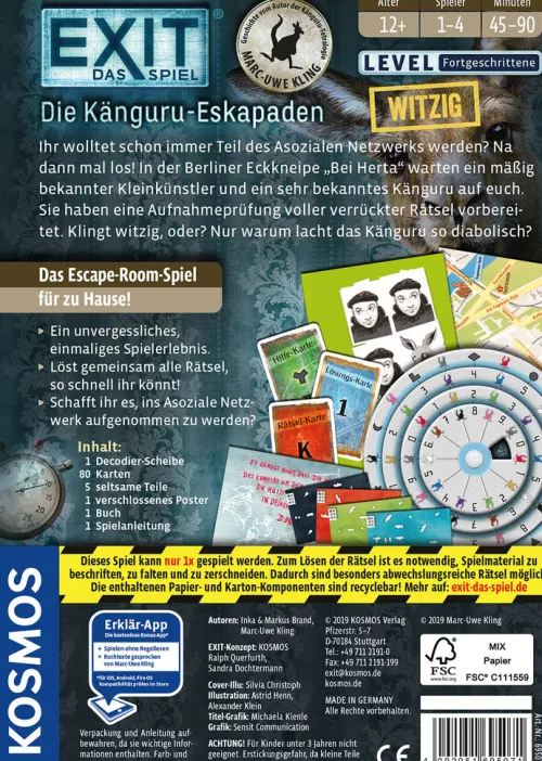 Neues aus der Erfolgsreihe EXIT Das Spiel! Dieses Mal wird’s clever, witzig und frech, denn bei den Känguru-Eskapaden dreht sich alles um das lustige Beuteltier, bekannt aus den Känguru Chroniken des Bestsellerautors Marc-Uwe Kling. In diesem Escape-Room-Spiel für zu Hause müssen die sogenannten Schnuffies den Aufnahmetest ins Asoziale Netzwerk schaffen. Das ist gar nicht so einfach, weshalb bei diesem Spiel für Erwachsene besonders Teamgeist und eine Portion Querdenken gefragt ist. Ein ungewöhnliches EXIT Abenteuer mit Rätseln für Fortgeschrittene.