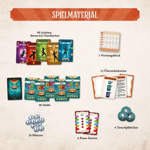 Ein farbenfrohes Zirkuserlebnis: taktisches Deckbau-Kartenspiel voller ReisestimmungDer Wanderzirkus tourt durch Europa und stellt in jeder Stadt eine neue Vorstellung zusammen. Das Kartendeck wächst von Runde zu Runde, indem immer neue Artisten angeworben und in zukünftige Shows integriert werden. Farbige Verbindungen, unterschiedliche Artistenfähigkeiten und taktische Reihenfolgen sorgen für abwechslungsreiche Vorstellungen. Klare Abläufe ermöglichen einen leichten Einstieg, während wechselnde Städte, Kartenkombinationen und Entscheidungen jedes Spiel abwechslungsreich machen. Mit Solo-Modus, Profi-Variante und Runden für ein bis sechs Personen: flexible Spielweisen und Herausforderungen für verschiedene Erfahrungsniveaus. Der Zirkus ist in der Stadt! Der Wanderzirkus entführt in diesem Deckbau-Spiel in eine zauberhafte Welt voller einzigartiger Artistinnen und Artisten. In jeder Runde wird sowohl die Stadt gewählt, in der der eigene Zirkus als Nächstes gastiert, als auch eine neue Attraktion. Für jede Vorstellung muss auch eine Mindestanzahl von Artistinnen und Artisten festgelegt werden, die bei Erreichen Punkte bringt. Dann startet die Show! Dafür legen die ein bis sechs Spielerinnen und Spieler ihre Karten nach dem Domino-Prinzip aneinander, um lange und punkteträchtige Ketten zu bilden. Im taktischen Kartenspiel ab zehn Jahren warten wundersame und spannende Wendungen: Wer sammelt die meisten Punkte und stellt die beste Zirkus-Show auf die Beine?