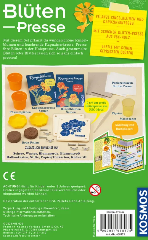 Wunderschöne Blumen selbst züchten, sammeln und haltbar machen: Kinder zwischen 6 und 12 Jahren pressen Blüten, Blätter und kleine Pflanzen und erforschen sie. Die Blütenpresse zum Mitnehmen: handlich, aus FSC-zertifiziertem Holz und 9×9 cm groß ist sie perfekt für Entdeckungsrundgänge in der Natur und kinderleicht zu benutzen. Das Komplett-Set enthält Anzuchttöpfchen, Erde und Samen von Ringelblume und Kapuzinerkresse, die von den Kindern selbst angepflanzt werden. Die gepressten Blüten als Deko, im Herbarium oder zum Basteln nutzen? Na klar! Die Anleitung enthält eine tolle Bastelidee für die gepressten Trockenblumen und zeigt, wie ein Herbarium angelegt wird. Mit der KOSMOS Blütenpresse gehen Kinder immer wieder auf Entdeckungsreise in der Natur und machen ihre gesammelten Pflanzen-Schätze mit der Presse für lange Zeit haltbar. Bunte Blüten, die nie verwelken! Mit der handlichen Blütenpresse aus FSC-Holz entstehen aus Ringelblumen und Kapuzinerkresse wunderschöne Trockenblumen. Die Blumen werden dafür mit dem enthaltenen Anzucht-Set selbst herangezogen und anschließend gepresst. Ob blumige Grußkarten oder das erste selbst angelegte Pflanzen-Herbarium – für Kinder ein spannendes Projekt. Doch bevor die gepressten Blüten oder Blätter für Bastelprojekte genutzt werden, nehmen die Kinder die Pflanzen ganz genau unter die Lupe: Wie ist die Blüte aufgebaut und welche Strukturen hat ein Blatt? Die Anleitung erklärt die wichtigsten Details und zeigt, wie Pflanzen durch das Pressen haltbar gemacht werden. Und wer noch nicht genug hat, schnappt sich einfach die Blütenpresse und sammelt in der Natur weitere Pflanzen zum Pressen. Ein tolles Mitbringsel von KOSMOS.