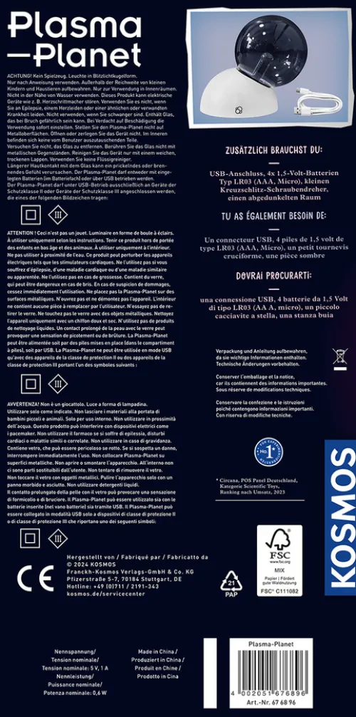 Als Klassiker unter den Science-Spielereien ist der Plasma-Planet mit seinen berührungs- und sound-gesteuerten Blitzen ein Muss für alle Wissenschaftsfans. Die rötlich-violetten Lichtblitze erschaffen eine einmalige Atmosphäre. Dabei reichen leichte Berührungen der transparenten 12 cm großen Kugel, um die Blitze auf einen Punkt zu konzentrieren oder sie über die Oberfläche wandern zu lassen. Bei KOSMOS besonders genial: Der Plasma-Planet verfügt über einen Soundsensor! So reagieren die Blitze auch auf Geräusche und zucken sogar im Takt von Musik. Physik zum Anfassen: In der beiliegenden Anleitung werden die wissenschaftlichen Hintergründe der Plasma-Kugel rund um Elektrizität und Edelgasen anschaulich erklärt. Dieser Experimentierkasten darf in keinem Teenie-Zimmer fehlen. Ein cooles Geschenk für alle Science-Fans ab 14 Jahren. Ein Muss für jedes Teenie-Zimmer und der Klassiker unter den Science-Spielereien: Der faszinierende Plasma-Planet lässt Blitze zucken und gibt jedem Raum eine einmalige Atmosphäre. Bei dem Gerät von KOSMOS besonders genial: Die Blitze können nicht nur durch Berührungen an der Innenseite der Kugel gebündelt werden, sondern auch über den eingebauten Soundsensor gesteuert werden. So reagieren die Lichter nicht nur auf laute Geräusche, sondern zucken sogar im Takt von Musik! Einfach und verständlich werden in der Anleitungen Hintergründe zu Elektrizität und Edelgasen erklärt und der Betrieb per USB-C-Kabel sorgt für endlosen Spaß. Dieser Experimentierkasten ist Physik zum Staunen!