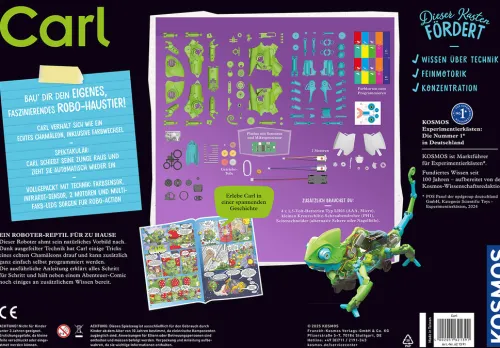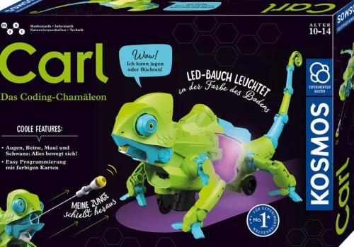 Hier erwacht Carl, das Roboter-Chamäleon, zum Leben! Ohne Vorkenntnisse können Kinder seine Bewegungen und Verhalten selbst programmieren und steuern und erleben seine beeindruckenden Funktionen. In seinen drei Modi (Jäger, Haustier oder Coding) pirscht sich das Chamäleon an wie in der Natur, läuft und fängt sogar Beute mit der Zunge! Dank Licht- und Bewegungssensoren sowie leuchtendem LED-Körper tarnt sich das Chamäleon und passt seine Farbe dem Untergrund an. Die Anleitung erklärt den Aufbau des Roboters, zeigt, wie er mithilfe der Farbkarten programmiert wird und gibt faszinierende Infos zum Programmieren und Robotik. Dieser KOSMOS Experimentierkasten vermittelt Kindern ab acht Jahren erste Grundkenntnisse des Programmierens und sorgt für Spielspaß der ganz besonderen Art. Aufgepasst, jetzt kommt Carl! Bewegliche Beine und Augen, ein einstellbarer Schwanz, eine herausschnellende Zunge sowie der leuchtende, farbwechselnde Körper lassen diesen Roboter fast wie ein echtes Chamäleon aussehen und sorgen für stundenlangen Spiel- und Programmierspaß. Denn durch die geniale Möglichkeit, Carl den Chamäleon-Roboter selbst zu programmieren, können Kinder auch ohne Vorkenntnisse Carls Verhalten und seine Bewegungen vollständig selbst steuern! Ausgestattet mit verschiedenen Sensoren, „liest“ das Chamäleon die beigelegten Farbkarten und führt die programmierten Aktionen aus.