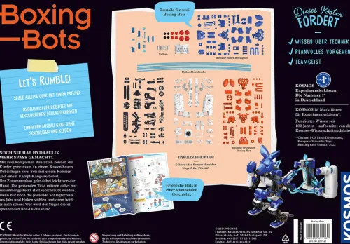 Aufgebaut, in den Ring und los! Zwei Roboter in einem Set im Duell um den Titel des Hydraulik-Champions. Mit praktischem Klick-Steck-System lassen sich die Robert kinderleicht aufbauen und konfigurieren – ganz ohne Schrauben oder Batterien! Faustschlag, Blocken oder ein spektakuläres Ausweichmanöver? Kein Problem, mit der hydraulischen Steuerung per Joysticks! Die aufwendig illustrierte und leicht verständliche Anleitung liefert zusätzlich spannendes Hintergrundwissen zu Hydraulik und Pneumatik. Der KOSMOS Experimentierkasten Boxing Bots für Kinder zwischen zehn und 14 Jahren verwandelt jedes Kinderzimmer in einen physikalischen Boxring und sorgt für actionreiche Spielstunden. Hier geht’s um mehr als Boxen! Denn mit den Boxing Bots von KOSMOS wird Physik voller Action erlebbar. Die beiden im Experimentierkasten enthaltenen Roboter-Bausätze lassen sich ohne Schrauben zu zwei Bots zusammenbauen, die mit spektakulären Schlägen, Block- oder Ausweichmanövern im Ring gegeneinander antreten können. Dank der enthaltenen Punktezähler ist immer klar, wer gerade vorne liegt, und die Strategie der beiden SpielerInnen entscheidet über Sieg oder Niederlage. Das Besondere an den Bots: Sie kommen vollkommen ohne Batterien aus! Die Bedienung erfolgt über Joysticks, die die Bewegungen dank Hydraulik übertragen. So wird das Kinderzimmer zum physikalischen Boxring!