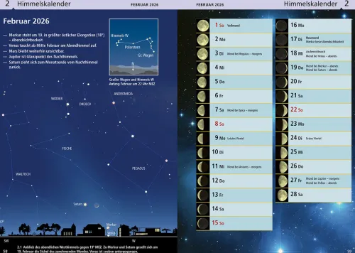 Das Himmelsjahr bietet aktuelle Himmelsschauspiele, zuverlässige kalendarische Angaben und die beliebten Monatsthemen. So erfährt man zum Beispiel, wann die Sonne aufgeht, welche Mondphase gerade herrscht und wo die Planeten zu finden sind. Die Monatsthemen erläutern astronomische Phänomene und gehen auch auf aktuell diskutierte Fragen ein. Über die KOSMOS-PLUS-App erhält man das Wichtigste zum Himmelsgeschehen für unterwegs. Highlight 2026: Am 12. August 2026 findet über Europa eine totale Sonnenfinsternis statt! Zu sehen von Nordspanien und den Balearen. Nur zwei Wochen später schmückt eine tiefe partielle Mondfinsternis den Himmel.