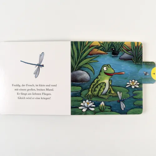 Freddy, der Frosch ist klein und rund mit einem großen, breiten Mund – er fängt am liebsten Fliegen! Ein vergnügtes Pappbilderbuch von dem Illustrator des Grüffelo mit einfachen und lustigen Versen, in denen kleine Kinder mit dem kleinen Frosch singen und quaken können. Mit je vier Elementen zum Schieben und Ziehen. In derselben Ausstattung gibt es das Pappbilderbuch »Lissy, das Lämmchen«.