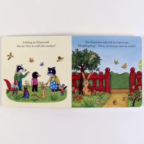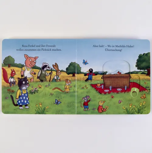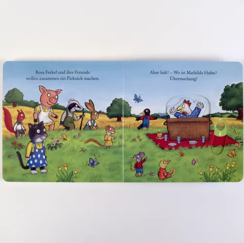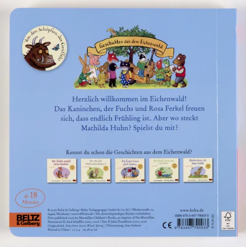 Was für ein schöner Frühlingstag! Das Kaninchen ruht sich im Gartenstuhl aus, Fred Eichhorn hängt die Wäsche in den Wind, der Fuchs sucht Osterglocken und Rosa Ferkel lädt alle Freunde aus dem Eichenwald zum Frühjahrs-Picknick ein! Aber wo ist Mathilda Huhn? Ein liebenswertes Pappbilderbuch mit ganz einfachen Zieh- und Schiebeelementen für Kinder ab 18 Monaten. Geschichten aus dem Eichenwald von den Schöpfern des Grüffelo: Kleine Alltagsgeschichten von Bär und Dachs und seinen Freunden mit lustigen Bildern.
